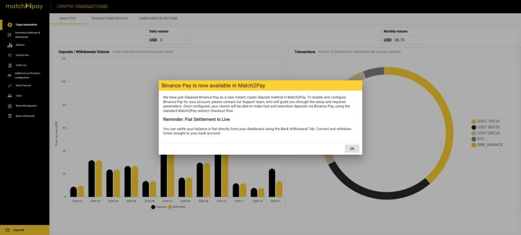 Match2Pay has integrated Binance Pay into its payment infrastructure, offering brokers, fintechs, and merchants an instant crypto deposit solution designed to reduce friction and improve deposit conversion. This integration leverages Binance’s internal payment network to eliminate common challenges associated with traditional on-chain crypto transfers.